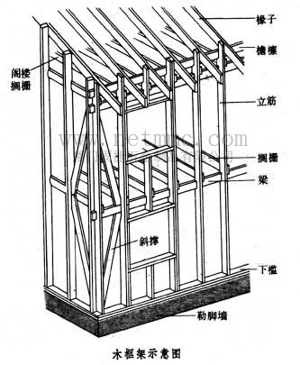 框架式結(jié)構(gòu) 由木制的立筋、梁、擱柵和椽子等構(gòu)件組成骨架,再鋪設(shè)屋面和樓面,砌筑內(nèi)外墻(見圖)。構(gòu)件可以現(xiàn)場制作,也可預(yù)制裝配??蚣苁侥窘Y(jié)構(gòu)建筑是西方國家的一種傳統(tǒng)建筑類型。