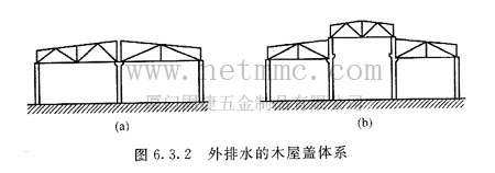 當(dāng)木桁架不多于兩跨或三跨時,如有條件,可做成外排水的木屋蓋體系(圖6.3.2),并利用側(cè)窗采光。