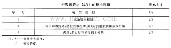 桁架跨度中央的高度h與跨度l的比值稱為高跨比。為保證桁架具有足夠的剛度,按桁架的外形,分別規(guī)定木桁架、鋼木桁架高跨比的最小限值如表6.3.1所示。