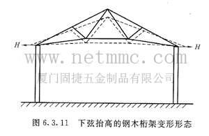 4) 為防止圓鋼下弦拉直伸長對墻體產(chǎn)生推力,不應(yīng)采用下弦抬高的桁架形式(圖6.3.11)。安裝跨度較大的桁架時(shí),應(yīng)在桁架一端支座節(jié)點(diǎn)的鋼墊板與柱頂鋼板之間放設(shè)數(shù)根短圓鋼,以允許其向外自由水平滾動,待屋面構(gòu)件和瓦材安裝完畢后,再將短圓鋼與柱頂鋼板焊牢。此時(shí)應(yīng)注意檢查支座反力作用點(diǎn)的位置與設(shè)計(jì)是否相符;必要時(shí)要作適當(dāng)調(diào)整。
