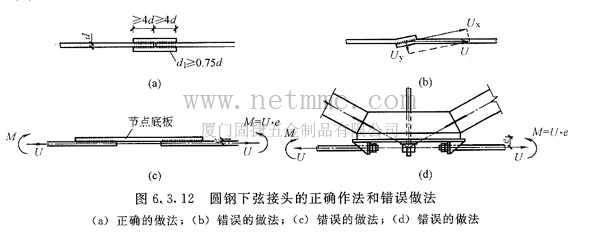 5) 圓鋼接長宜用對接焊或雙幫條焊(圖6. 3. 12a) 。在接頭的每一側(cè),幫條的長度一般應(yīng)不小于4d (d為圓鋼下弦的直徑)。幫條的直徑應(yīng)不小于0.75d。不應(yīng)采用搭接焊(圖6. 3. 12b)或?qū)A鋼單側(cè)焊在節(jié)點(diǎn)板上(圖6. 3. 12c),以免在圓鋼和焊縫中產(chǎn)生附加應(yīng)力。當(dāng)采用閃光對焊時(shí),焊接工藝和質(zhì)量驗(yàn)收,應(yīng)符合現(xiàn)行《鋼筋焊接及驗(yàn)收規(guī)程》中的有關(guān)規(guī)定。