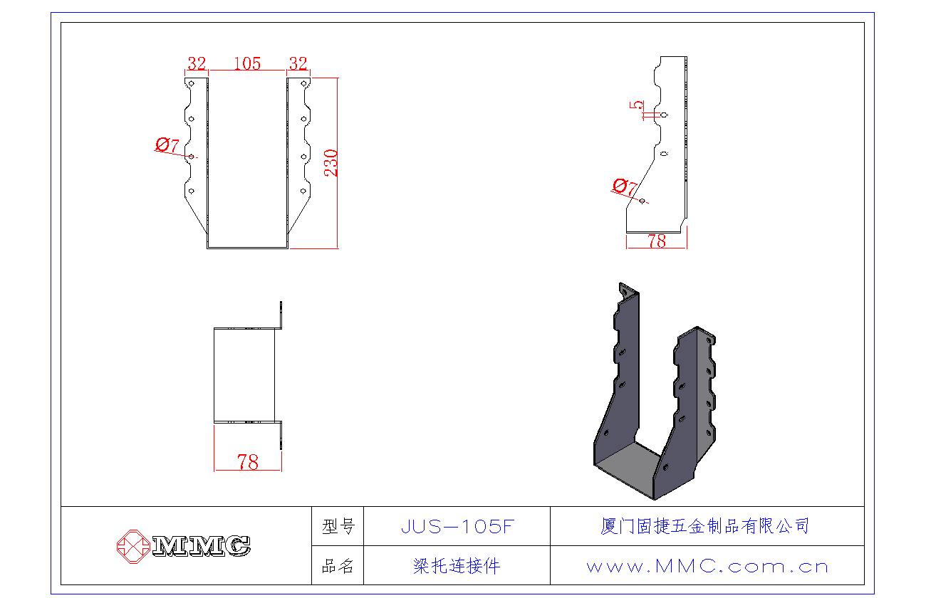 JUS-105F 梁托-U型掛件-龍骨與橫梁水平連接件-木結(jié)構(gòu)別墅金屬配件