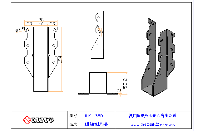 MMC連接件系列,適用于38-40MM的龍骨與橫梁間的連接,廣泛應(yīng)用于各種木屋、木棧道、花架、涼亭等木結(jié)構(gòu)建筑,用于2*10(38*235)的梁的托掛連接件